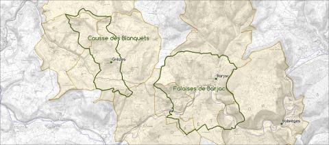 Les deux sites recoupent sept communes : Balsièges, Barjac, Cultures, Esclanèdes, Grèzes, Montrodat, Palhers.